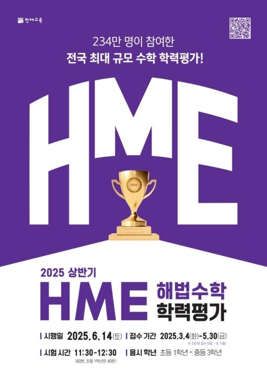 천재교육이 주최하는 '2025년 상반기 HME 전국 해법수학 학력평가'가 오는 6월 14일(토) 시행된다.