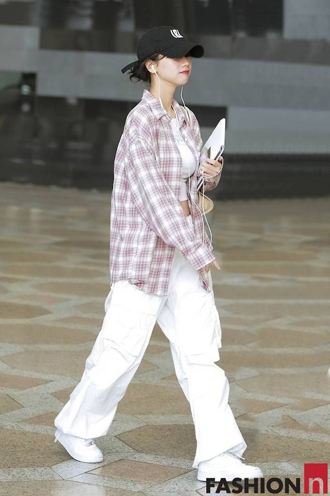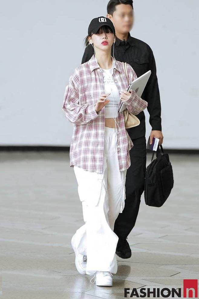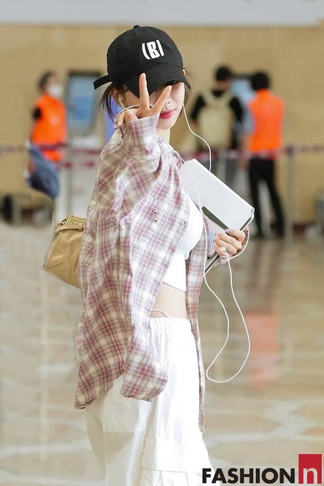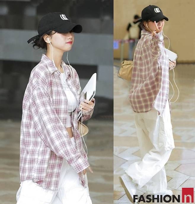 이날 카리나는 버튼다운 체크 셔츠와 화이트 팬츠, 여기에 볼캡을 매치한 무심한 듯 힙한 일상룩으로 눈길을 사로잡았다.