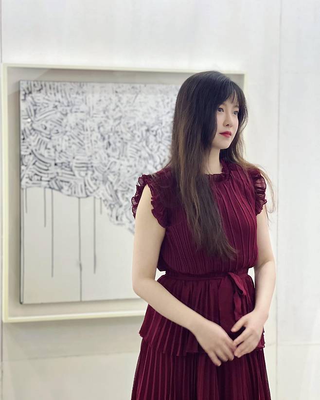 구혜선은 와인 컬러의 플리츠 드레스를 입고 있다. 러플 소매와 허리 리본 디테일이 여성스러움을 강조하며, 단정한 실루엣이 미술관의 차분한 분위기와 조화를 이룬다. 긴 생머리와 절제된 표정이 더해져 우아하고 예술적인 감각을 드러낸다