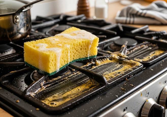 기름때는 일반 세제로도 잘 안 지워질 때가 많습니다. 이때 식초를 묻힌 수세미로 문지르면 굳은 기름이 부드럽게 풀립니다.