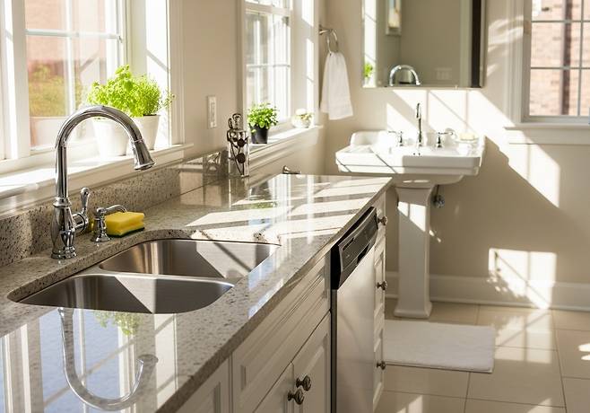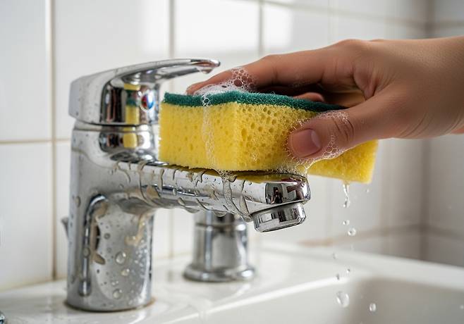 수세미에 식초를 살짝 묻혀 싱크대를 닦아보면 물때와 기름기가 한 번에 정리됩니다. 식초의 산성 성분이 물때를 풀어주고, 수세미가 오염을 긁어내는 역할을 합니다.