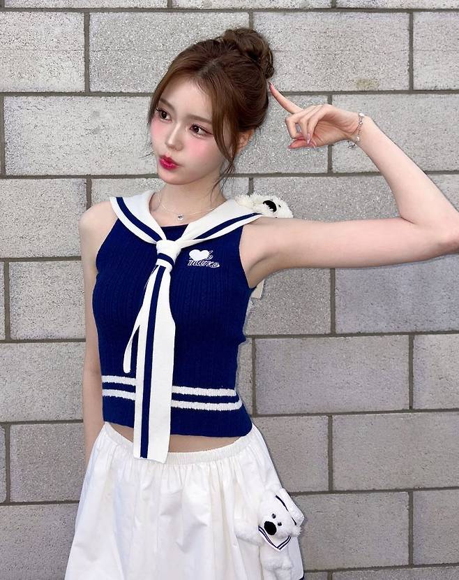이처럼 정세비의 세일러룩 스타일은 데일리로는 물론, 페스티벌이나 촬영용 코디로도 손색이 없다. 크롭 니트 베스트는 하이웨이스트 하의와 매치하면 더욱 다리가 길어 보이는 효과를 줄 수 있다.