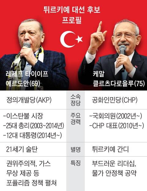 영국 이코노미스트는 튀르키예의 건국 100주년인 오는 14일 치러지는 대통령 선거를 이렇게 평가했다. 이번 대선에선 20년간 튀르키예를 철권통치해 온 레제프 타이이프 에르도안 현 대통령에게 맞서는 야권의 연합 후보가 2파전을 벌인다. 민주주의의 ‘선’을 넘으며 독재를 꿈꾸는 집권당(정의개발당)의 에르도안과 터키의 ‘다른 미래’를 부드러움으로 이끌어내겠다는 6개 야당 연합이 추대한 케말 클르츠다로을루 공화인민당 대표가 표 대결을 벌이고 있다.