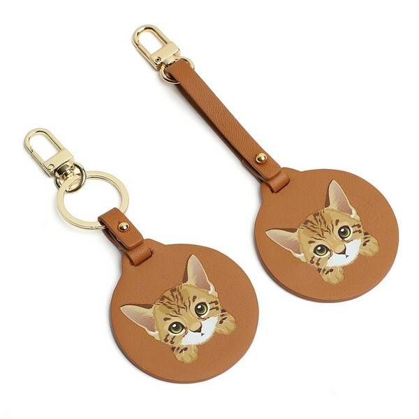 가죽 소재의 고양이 디자인이 그려진 키링이에요. 끈 길이가 다른 두 개의 키링이 한 세트로, 색상도 브라운 외에도 네이비, 카키, 레드, 피치 등 다양하답니다.