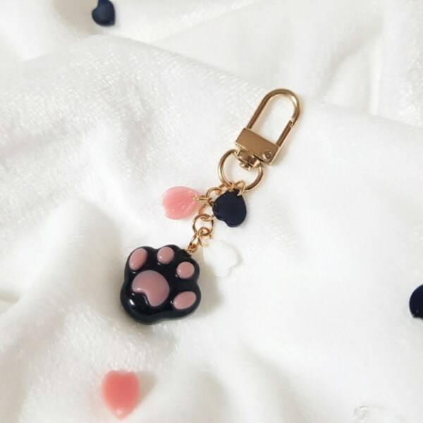 레진으로 굳혀 단단하고 귀여운 고양이 발바닥 모양의 키링이에요. 크기가 작아서 자동차 키나 무선 이어폰 케이스에 달아도 무겁지 않고 걸리적거리지 않아 좋답니다.