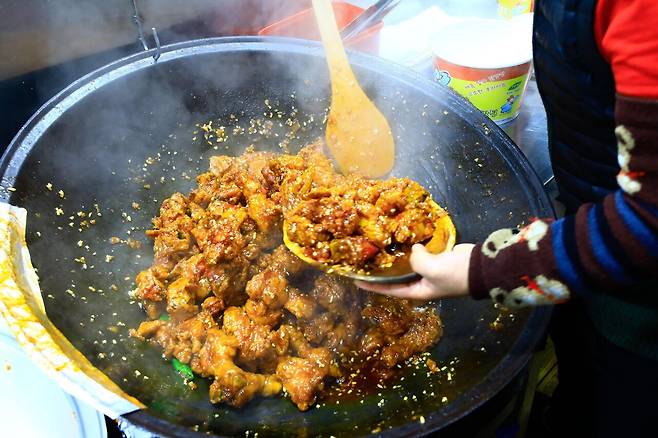 특히, 페리와 크루즈를 타고 찾아오는 많은 관광객 덕분에 국제적인 분위기가 더해졌죠. 신포국제 시장의 인기 먹거리는 닭강정입니다. 달콤하고 매콤한 소스를 얹은 바삭한 튀김 닭고기는 이곳을 대표하는 맛이죠.