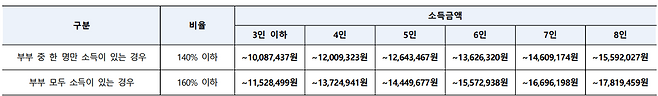 자산요건(3.31억 이하) or 소득기준(아래 표) 중 하나만 충족하면 됨. 부부 중복 청약 가능