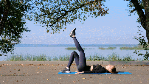 매트 위에 오른쪽 팔뚝을 대고 옆으로 누워 자세를 잡습니다. 왼손은 바닥을 짚어 몸의 균형을 유지하고, 왼쪽 다리를 공중으로 들어 올렸다가 내리는 사이드 레그레이즈 동작을 반복합니다.