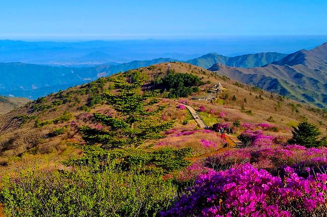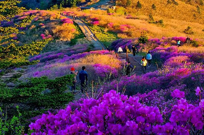 등산로를 따라 걷다 보면 자연이 만들어낸 색의 향연을 만끽할 수 있고, 정상에 오르면 산자락을 내려다보며 진달래의 장관을 온몸으로 느낄 수 있다.