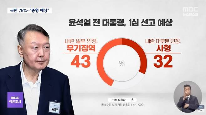 국민들 대다수의 예상 역시 유죄 선고에 압도적인 여론이 쏠리는 분위기입니다. 17일 MBC가 여론조사기관 코리아리서치인터내셔널에 의뢰해 실시한 여론조사 결과를 보면, 응답자 75%가 윤 전 대통령 1심 선고에서 중형 선고를 예상했다고 하는데요.