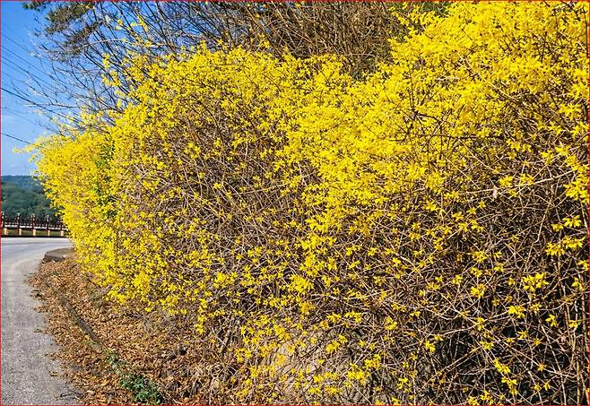 분홍빛 물결이 지나간 자리에는 선명한 노란색의 개나리 군락이 나타나 시선을 사로잡습니다. 벚꽃이 우아하고 고전적인 미를 뽐낸다면, 길가에 낮게 깔려 흐드러지게 핀 개나리는 재잘거리는 노란 병아리처럼 생기 넘치는 활력을 뿜어냅니다.