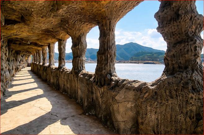 꽃길의 끝자락, 성류굴 본 굴에 들어가기 전 만나는 구간은 이 여행의 또 다른 하이라이트입니다. 마치 암벽을 깎아 만든 듯한 독특한 회랑 형태의 통로는 이국적인 분위기를 자아내며 훌륭한 포토존이 되어줍니다. 무엇보다 길옆으로 유유히 흐르는 물줄기 위로 햇살이 부서지며 만들어내는 ‘윤슬’은 한참 동안 발길을 멈추게 합니다.