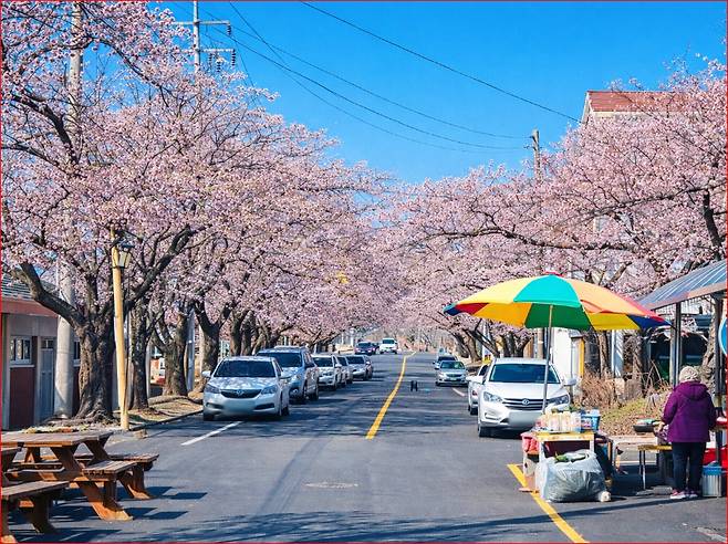 성류굴 앞길이 여행자들에게 사랑받는 결정적인 이유는 세심하게 마련된 휴식 공간에 있습니다. 길을 따라 벤치 테이블과 평상들이 정겹게 놓여 있어, 별도의 돗자리를 챙겨야 하는 번거로움 없이도 누구나 명당자리를 차지할 수 있습니다. 벚나무가 만들어준 천연 지붕 아래 앉아 있으면, 머리 위로는 꽃잎이 흩날리고 발치에는 분홍색 카펫이 깔리는 호사를 누리게 됩니다.