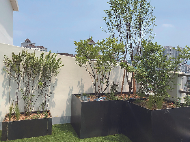 정원은 꽃과 나무를 좋아하는 클라이언트 니즈에 맞춰 다양한 사이즈의 코르텐강 플랜터를 제작하고 교관목과 그라스, 초화를 골고루 식재했다. 그리고 높이와 규격을 다양하게 조합해 디자인이 심심하지 않도록 계획했다. 플랜터는 무게뿐만 아니라 향후 해체하고 이동할 것까지 고려한 장치였다. 안개나무, 계수나무, 산수국, 바이오체리, 모닝라이트 그라스, 포니테일 그라스, 무늬억새, 말발도리, 블루베리, 자엽국수, 무화과 등 다양한 초화가 아름답게 어우러진 형태로 풍성하게 연출됐다.