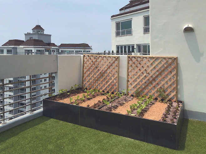 클라이언트의 요구 사항 중 텃밭도 있었기에 이곳 역시 낮은 플랜터로 제작했다. 여기에 레티스를 설치해 다소 밋밋한 모습을 보완하고 작물 재배 시 지지대로 역할을 할 수 있도록 했다. 이곳에서 텃밭을 이용할 노부모의 허리 건강을 고려해 입식으로 텃밭을 이용할 수 있도록 높이를 줘 맞춤 제작했다. 이처럼 플랜터는 라이프스타일에 맞춰 원하는 대로 제작하고 이용할 수 있으니 활용도가 높다.