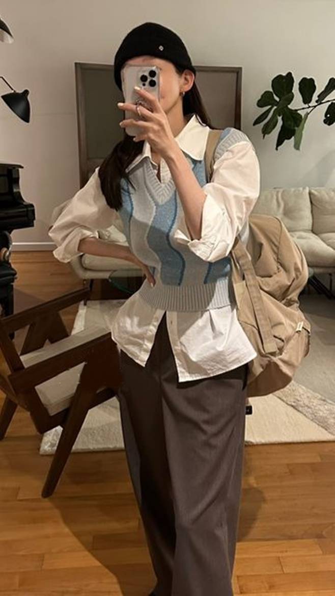 강민경은 25일 자신의 인스타그램 스토리에 와이드팬츠와 화이트 셔츠에 니트 베스트를 레이어드한 스타일리시한 뷔스티에룩을 하고 셀카를 찍고 있는 모습을 공개했다.