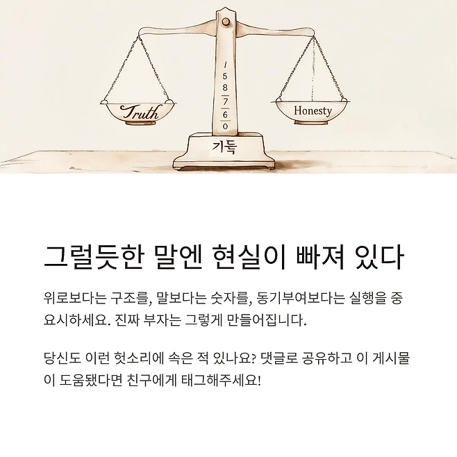 지금부터는 말이 아니라, 실제 돈의 흐름을 따라가세요.말이 아닌 잔고를, 강의가 아닌 구조를, 동기부여가 아닌 숫자를 보세요.