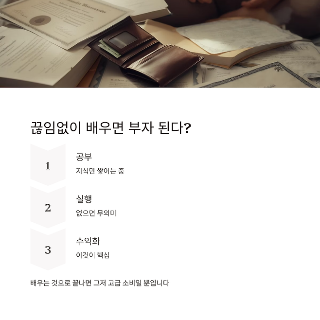 공부를 많이 하는 건 나쁘지 않습니다. 하지만 공부가 소비로 끝나면, 그건 비용이지 자산이 아닙니다.부자는 배우되, 반드시 수익화 루트를 먼저 설계합니다.