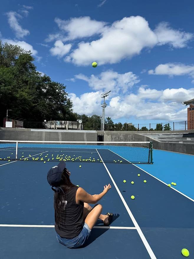 쨍한 가을 햇살이 파란 테니스 코트 위로 쏟아져 내리고, 노란 벽은 싱그러운 에너지를 더합니다.