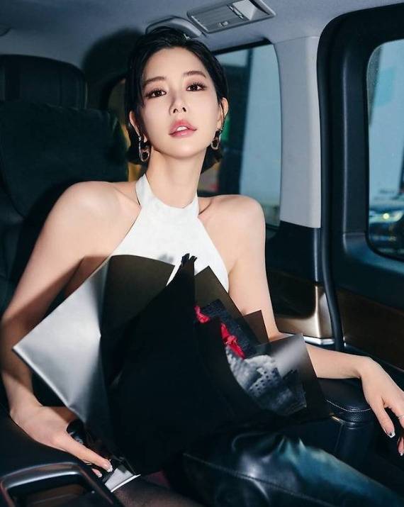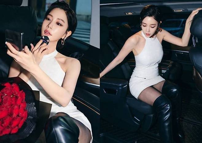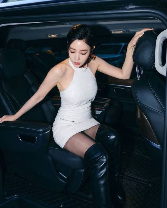 몸에 밀착되는 화이트 민소매 미니 드레스는 그녀의 완벽한 몸매를 더욱 돋보이게 했으며, 차 안에서도 빛나는 존재감을 과시했습니다. 특히, 하이넥 디자인과 절제된 실루엣은 우아함을 강조했고, 허벅지까지 올라오는 블랙 싸이하이 부츠는 강렬하면서도 시크한 매력을 더했습니다.