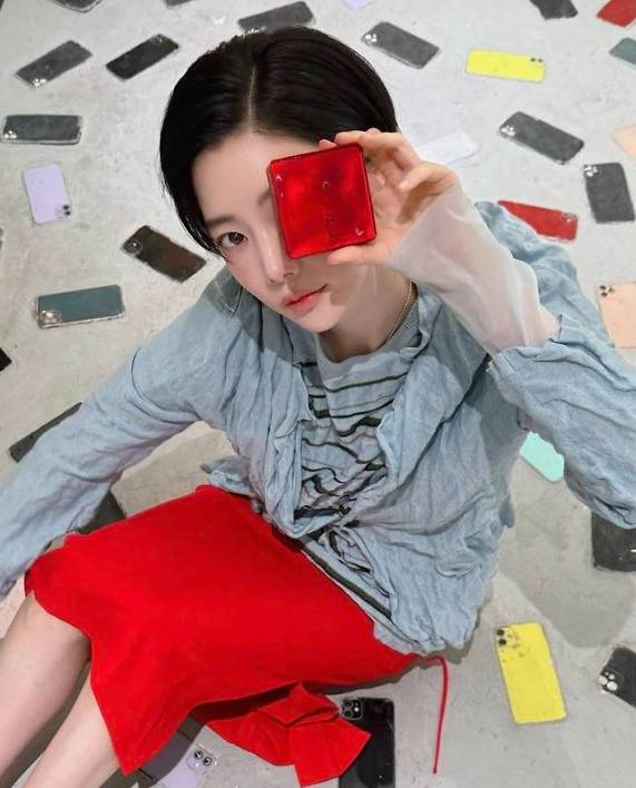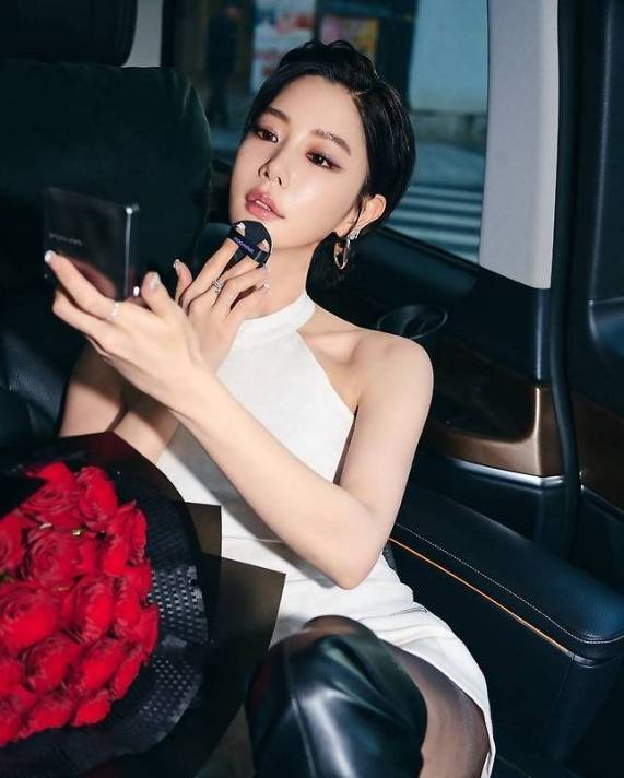 레드 로즈 부케를 품에 안고 메이크업 거울을 바라보는 그녀의 모습은 마치 한 장의 화보를 연상케 했습니다. 촉촉하게 빛나는 피부와 날렵한 아이 메이크업은 그녀의 완성형 비주얼을 더욱 돋보이게 만들었습니다.