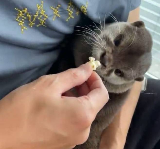 집사가 수달을 품에 안고 막 튀긴 팝콘을 내밀자 뜻밖의 일이 벌어집니다. 막상 팝콘을 들이밀자 고개를 휙 돌려 집사의 품에 얼굴을 파묻는 수달인데요.