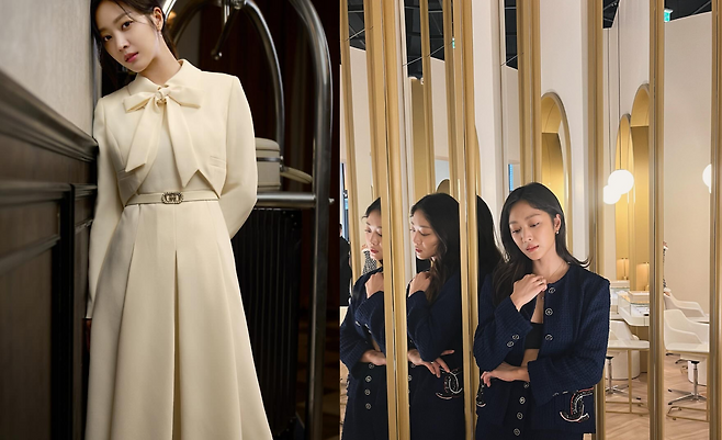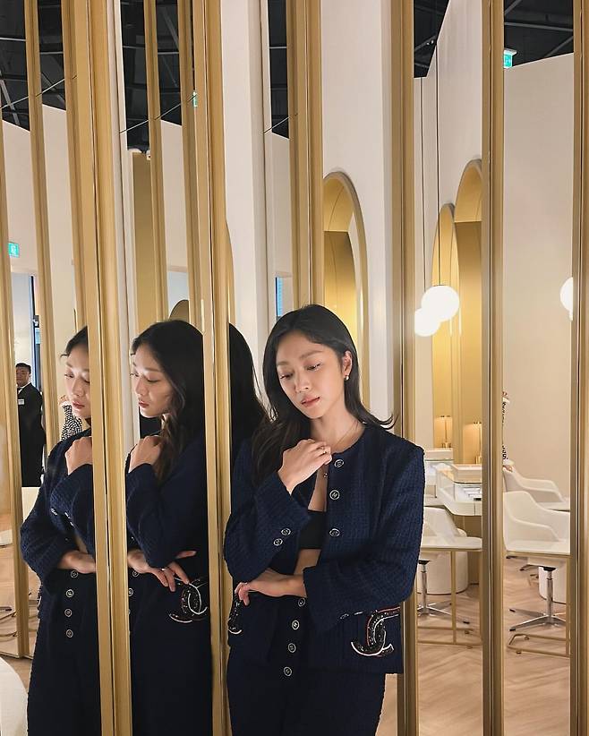 조보아는 네이비 컬러의 트위드 셋업으로 우아하면서도 세련된 이미지를 연출했다. 골드 버튼과 포켓 디테일이 클래식한 매력을 더하며, 크롭 디자인의 상의가 현대적인 감각을 부각시킨다. 고급스러운 소재와 디테일이 어우러져 특별한 자리에서 빛날 수 있는 스타일이다.