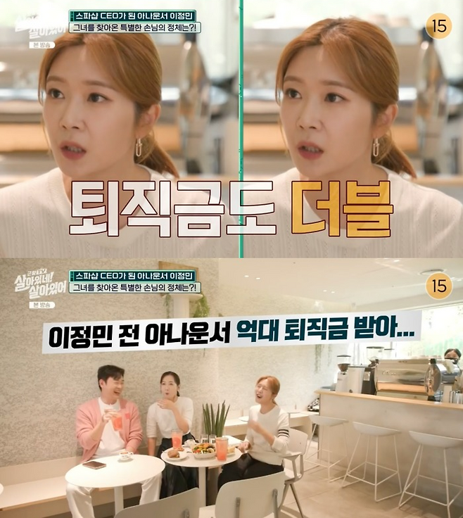 해당 방송에서는 후배 아나운서 부부인 조충현·김민정이 출연했는데요. 이정민보다 6년 늦게 입사하고, 3년 먼저 퇴사한 두 사람은 17년간 근무한 선배 이정민의 퇴직금은 얼마였냐고 단도직입적으로 질문했습니다.