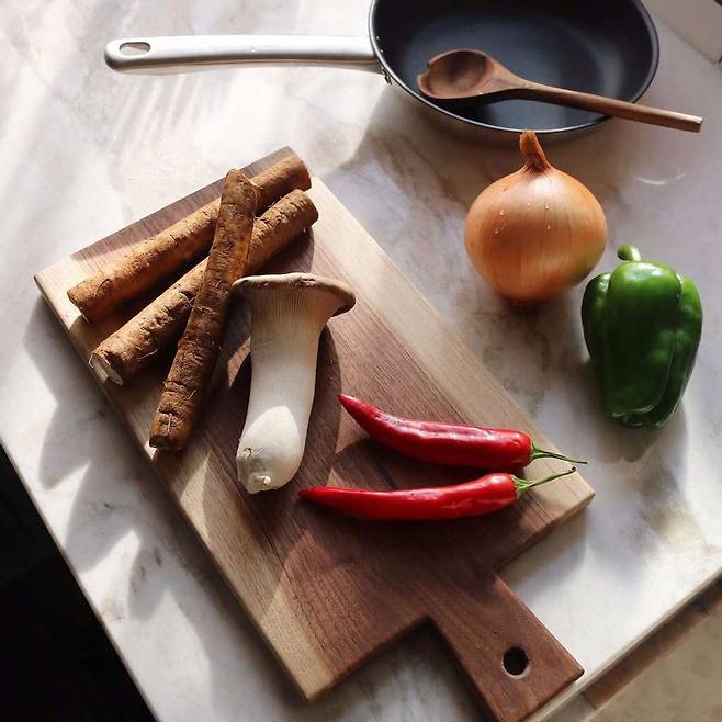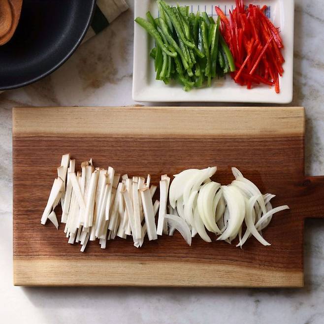 2. 새송이버섯과 양파, 푸른 피망, 홍고추도 채를 썬다.