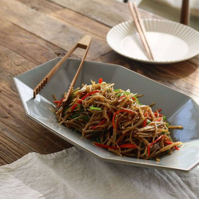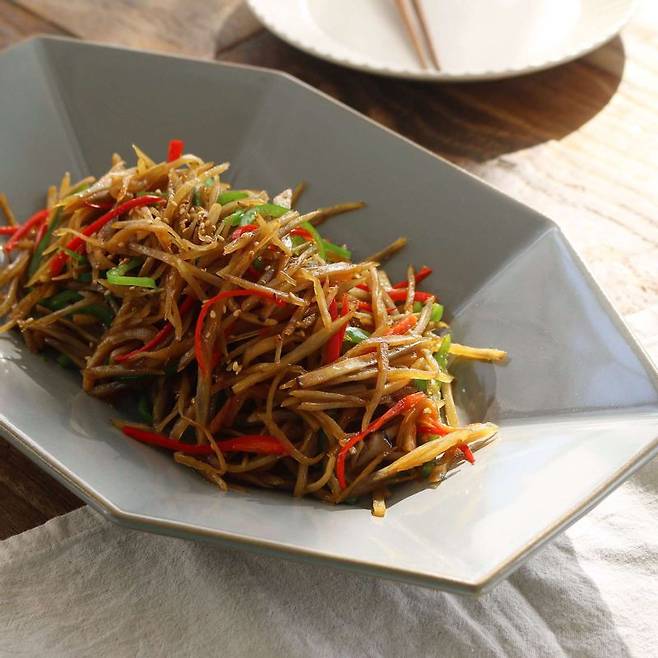 당면이 빠진다고 해서 잡채의 맛이 크게 변하진 않습니다. 우엉을 넣어도 다른 재료와 소스가 같기 때문에 잡채의 맛을 즐길 수 있습니다. 우엉의 아삭아삭한 식감에 영양소까지 보충됩니다. 우엉은 식이섬유가 많고 항염 작용이 뛰어난 재료입니다.조리 과정에서 우엉은 식초 물에 살짝 데치거나, 식초 물에 담갔다 사용하면 갈변현상을 막을 수 있습니다. 우엉의 아린 맛도 줄어듭니다.당면 대신 우엉으로 맛과 열량을 잡은 ‘우엉 잡채’ 레시피를 소개합니다.