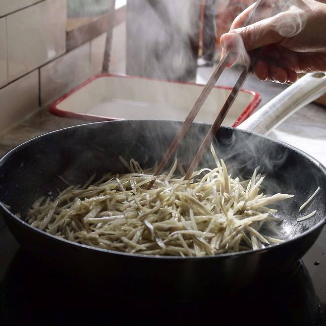 1. 찬물에 약간의 식초 물을 넣고 우엉채를 10분 정도 담근다. 물에 헹군 후 물기를 뺀다.