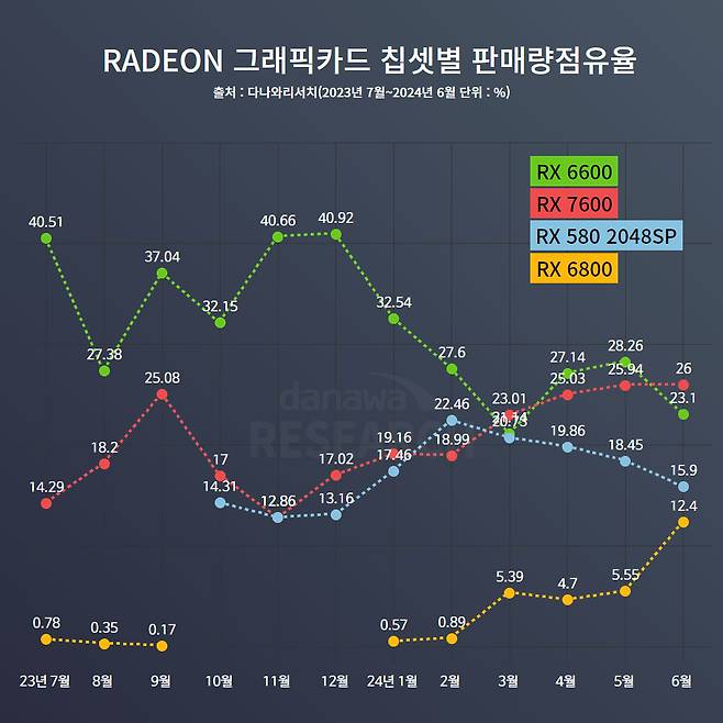 이런 RADEON 판매량 점유율 급상승 현상은 RX 7600 칩셋이 이끈 것으로 나타났다. 칩셋별 판매량 점유율을 보면 그동안 RADEON 그래픽 카드 중 40.92%까지 차지하던 RX 6600이 하향세를 그리며 23.1%까지 내려감과 동시에 RX 7600의 점유율이 1년 전 14.29%에서 2024년 6월에 들어 26%까지 올라 역전에 성공한 것이다. 덩달아 중국산 변종 칩셋인 RX 580 2048SP도 2024년 들어 판매량 점유율이 계속 내려가 15.9%에 그쳤다.