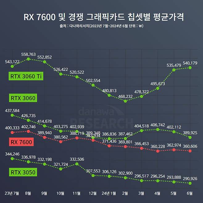 덕분에 RADEON 그래픽카드는 경쟁사가 가끔씩 헛발질할 때에만 반짝 흥행을 하는 존재였다. 별다른 대안이 없기 때문이다. 더불어 골수 RADEON 마니아들의 끊임없는 노력으로 지금까지 명맥을 계속 이어왔다고 할 수 있다. 하지만, 2024년 상반기와 하반기가 교차되는 요즘, 이 RADEON 그래픽 카드 시장에 훈훈한 미풍이 불고 있다고 한다. 과연 어떤 바람일까? 다나와 리서치 데이터를 통해 알아보자.