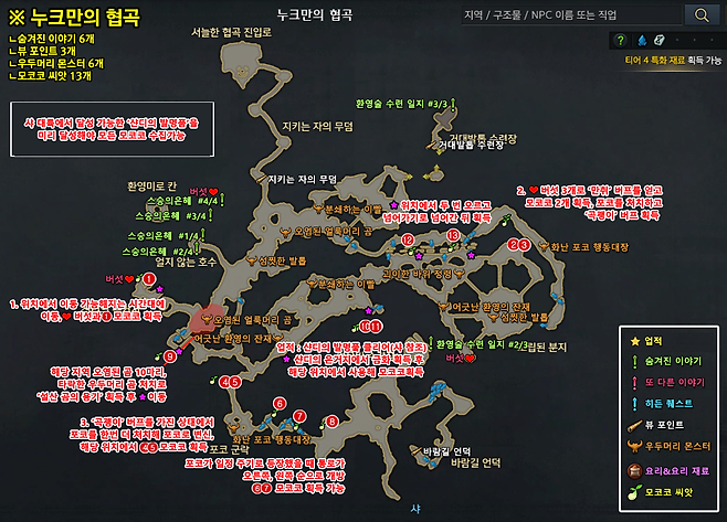 현재는 마지막 유물 요리 '천년삼 역주'와 호감도 NPC 2인을 빼면 모든 요소를 수집할 수 있다. 지난 쿠르잔 대륙의 바오라 뿌리찜처럼 순차 개방될 콘텐츠로 보인다. 전체적인 수집 난이도는 모코코를 제외하면 쉬운 편이다. 우두머리 몬스터의 숫자가 크게 줄었고, 숨겨진 이야기도 한 개의 대륙에서 끝나는 형태가 많다.
