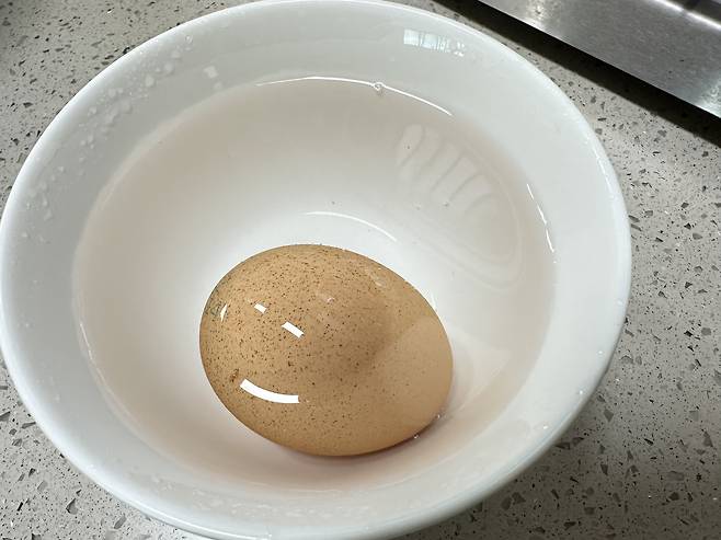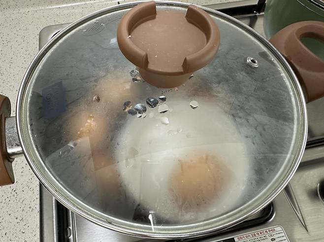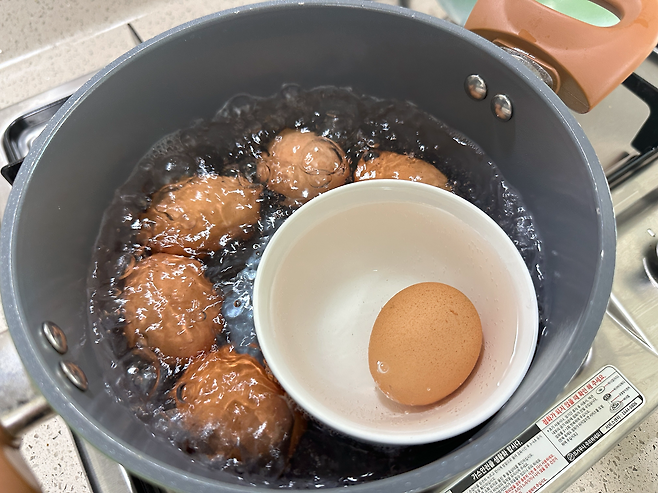 계란이 끓는 중에 냄비뚜껑을 열어보면 신기하게도 냄비 안에 들어 있는 물은 팔팔 끓고 있는데 그릇에 있는 물은 기포만 조금 생겨있습니다.