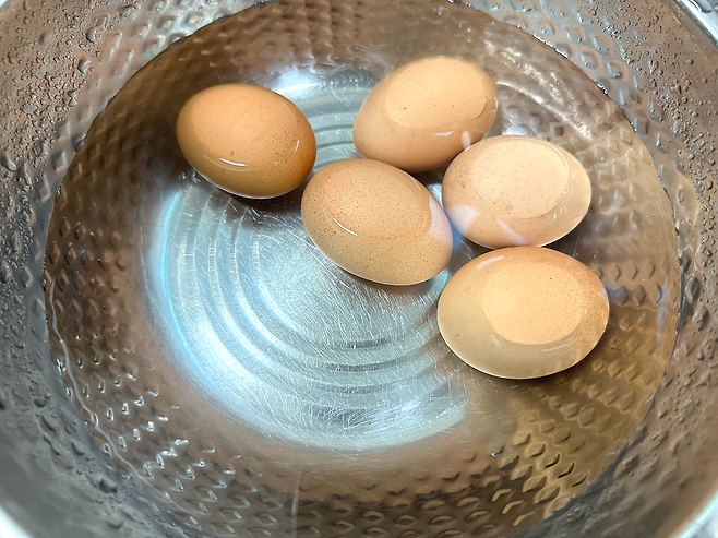 12분이 지나면 불을 끄고 계란을 건져 차가운 물에 담가주시면 계란껍데기와 계란이 달라붙지 않아서 소금이나 식초를 사용하지 않아도 쉽게 깔 수 있어요!