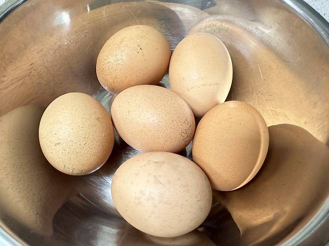 완숙으로 먹고 싶은 계란은 냄비에 그대로 넣어주고, 반숙으로 먹고 싶은 계란만 그릇에 넣어주면 됩니다.