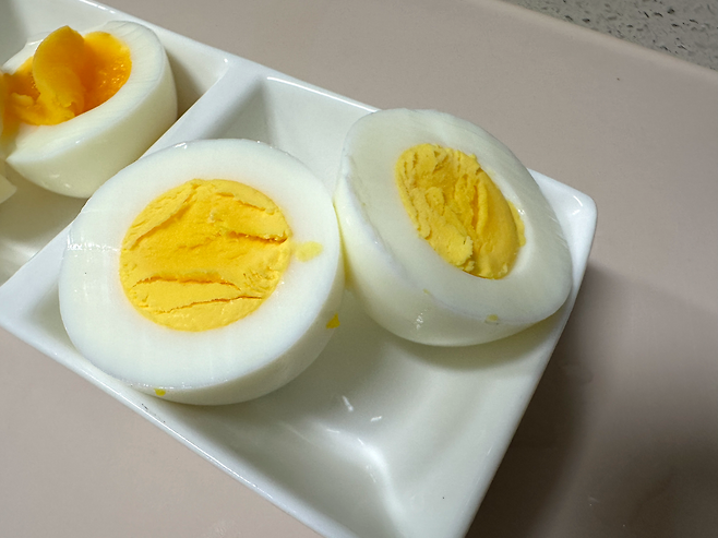 그릇에 들어 있던 계란 단면을 보니 반숙으로 잘 익어진 것 보이시죠? 한 냄비로 두 가지 계란을 삶을 수 있다니 너무 신기합니다.