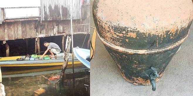 필리핀에서 자주 볼 수 있는 이 독특한 세면대는 한국인들에겐 무척 신선하게 다가오지만, 사실 필리핀 사람들에겐 실생활에서 필수적인 물건입니다. 대규모 하수 처리 시설이 부족해 낙후된 인프라에 의존하는 필리핀에서는 빗물이나 지하수를 모아 전통적인 석기 필터로 걸러 사용합니다. 이러한 원시적인 필터 방식은 불순물을 제거해 비교적 깨끗한 물을 공급하는 데 도움을 주고 있습니다.
