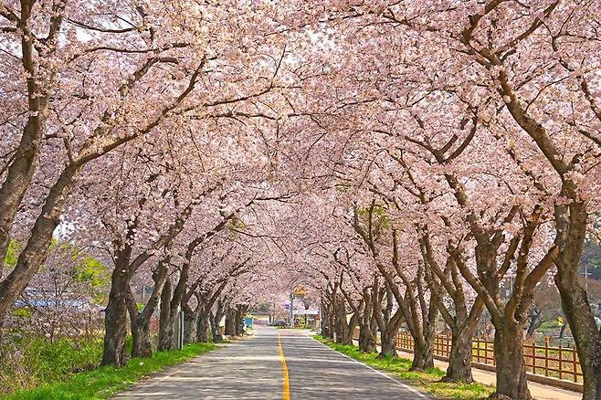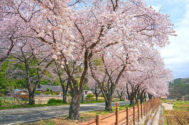 암곡의 벚꽃 터널은 약 300m 정도로 그리 길지는 않지만, 수령이 오래된 아름드리 벚나무가 빈틈없이 도로 위를 덮고 있어 마치 한 편의 동화 속 장면처럼 느껴집니다.