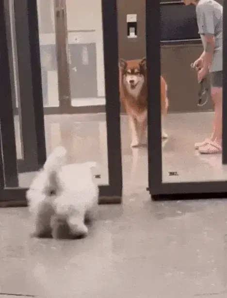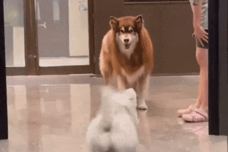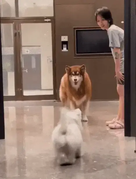 작은 강아지가 당당하게 덩치 큰 알래스칸 말라뮤트에게 다가가 활발하게 짖어댔습니다. 너무나 당찬 모습이었죠. 그런데 말라뮤트가 한 번 으르렁거리자, 작은 강아지는 순식간에 뒤로 도망치듯 물러섰습니다.