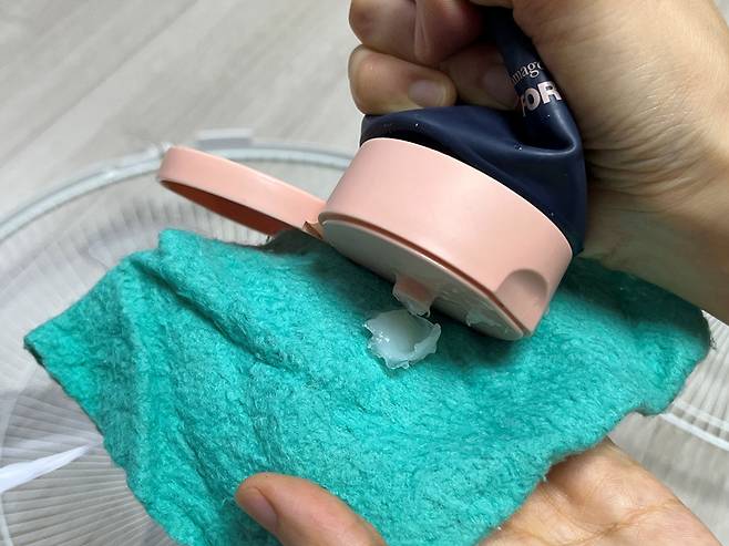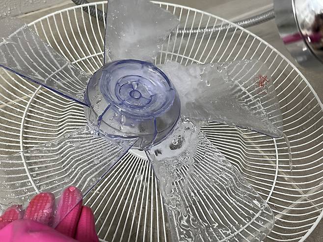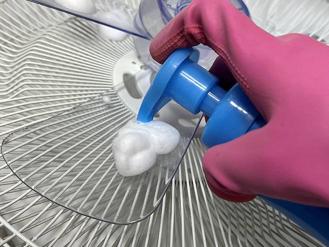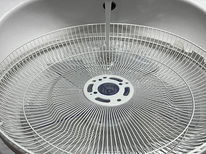 중성세제를 활용해 선풍기 덮개와 날개에 앉은 먼지를 모두 씻어냅니다. 선풍기 날개와 덮개는 세면대에 넣고 돌려가며 물을 묻혀 씻어냅니다.