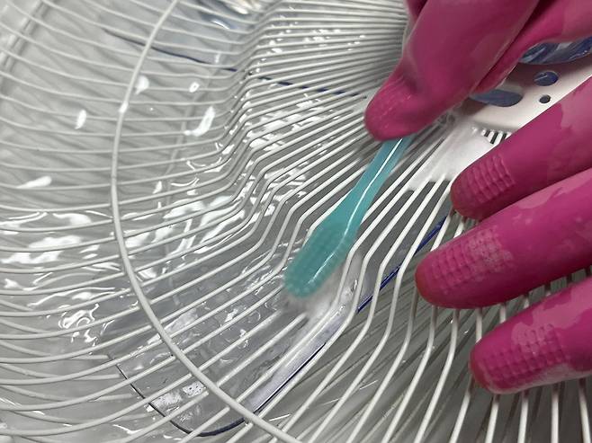수세미를 이용해도 되지만 칫솔을 활용하면 선풍기 덮개를 구석구석 닦아낼 수 있습니다. 일반 수세미보다 칫솔을 추천합니다.