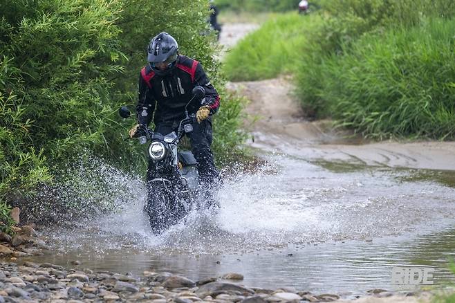 오전 교육은 여기서 종료. 읍내로 나가 점심식사를 했다. 그냥 식당이 거기 있으니 나가 먹은 것인가 생각했는데, 점심식사가 끝난 다음에도 곧바로 인근 홍천강변에서 교육이 이어졌다. 홍천강변은 강변 상당 부분이 자갈로 이루어져 있는데, 이곳을 달리며 흙길과는 다른 자갈길만의 특성을 파악해보는 것이다. 물론 오프로드는 노면이 고르지 않아 안정적인 주행이 쉽지 않지만, 모터사이클의 구조상 가속하면 넘어지지 않는다는 걸 머릿속에 넣고 가속을 해주면 넘어지지 않고 달릴 수 있다. 이때 시선은 수평으로 최대한 멀리 두고, 핸들바는 가볍게 잡아 너무 많은 힘이 들어가지 않게 해야 한다. 핸들바에 힘이 들어가게 되면 자칫 충격으로 돌아간 핸들이 복원되지 못해 그대로 넘어질 수 있기 때문. 설명을 듣고 조심스레 출발해보니 노면의 수많은 자갈들로 몸이 요동치지만 그대로 목표했던 방향으로 나아가기 시작한다. 기왕 오프로드에 나왔으니 작은 개울도 하나쯤 건너보고, 다시 펼쳐진 자갈밭에서 신나게 달리다보니 어느새 어둑해진 하늘에서 제법 굵은 빗방울이 떨어지기 시작했다. 그래도 색다른 오프로드만의 재미에 오히려 내리는 비는 땀을 식혀주니 고마울 정도였다.