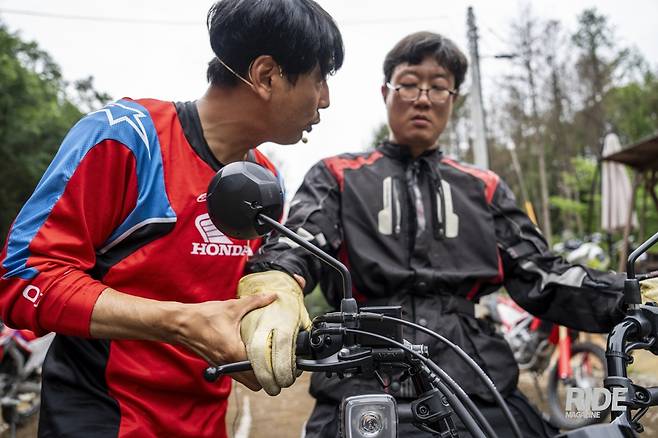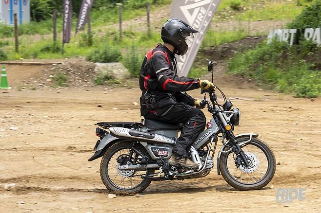 설명을 들었으니 이제 직접 타볼 차례. 오전 교육에선 혼다의 CT125를 타고 교육장을 달리기 시작했다. 시승을 통해 경험한 모델이기도 하고 125cc라서 가볍게 생각했지만, 아스팔트로 포장된 도로가 아닌, 포장되지 않은 땅, 오프로드에서 경험하는 것은 많이 달랐다. 여기에 전날 비가 내린 탓에 노면도 드문드문 젖거나 진흙탕이 되어 있어 자칫 미끄러질 수 있는 상황. 하지만 교육에서 배운 대로 적극적으로 몸을 움직여가며 가속과 감속을 반복해본다. 도로에서는 제동력이 높은 앞브레이크를 주로 사용하지만, 오프로드에서는 뒷브레이크를 주로 사용해야 한다. 즉 입장이 바뀐 셈. 그래도 뒷바퀴가 꽉 잠길 정도로 강하게 제동을 걸고 앞브레이크를 보태주면 안정적으로 강한 제동력을 끌어낼 수 있다.