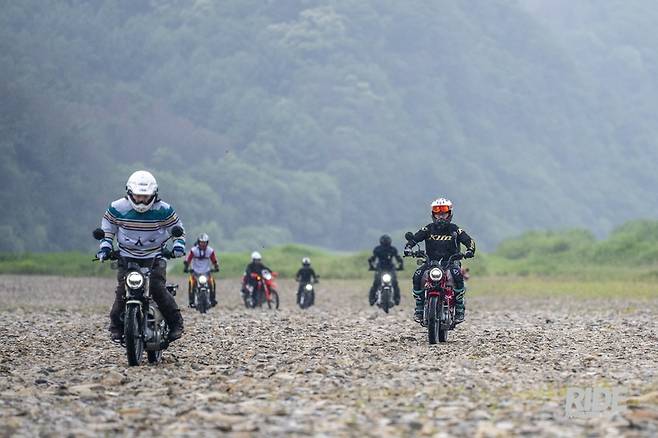 오전 교육은 여기서 종료. 읍내로 나가 점심식사를 했다. 그냥 식당이 거기 있으니 나가 먹은 것인가 생각했는데, 점심식사가 끝난 다음에도 곧바로 인근 홍천강변에서 교육이 이어졌다. 홍천강변은 강변 상당 부분이 자갈로 이루어져 있는데, 이곳을 달리며 흙길과는 다른 자갈길만의 특성을 파악해보는 것이다. 물론 오프로드는 노면이 고르지 않아 안정적인 주행이 쉽지 않지만, 모터사이클의 구조상 가속하면 넘어지지 않는다는 걸 머릿속에 넣고 가속을 해주면 넘어지지 않고 달릴 수 있다. 이때 시선은 수평으로 최대한 멀리 두고, 핸들바는 가볍게 잡아 너무 많은 힘이 들어가지 않게 해야 한다. 핸들바에 힘이 들어가게 되면 자칫 충격으로 돌아간 핸들이 복원되지 못해 그대로 넘어질 수 있기 때문. 설명을 듣고 조심스레 출발해보니 노면의 수많은 자갈들로 몸이 요동치지만 그대로 목표했던 방향으로 나아가기 시작한다. 기왕 오프로드에 나왔으니 작은 개울도 하나쯤 건너보고, 다시 펼쳐진 자갈밭에서 신나게 달리다보니 어느새 어둑해진 하늘에서 제법 굵은 빗방울이 떨어지기 시작했다. 그래도 색다른 오프로드만의 재미에 오히려 내리는 비는 땀을 식혀주니 고마울 정도였다.