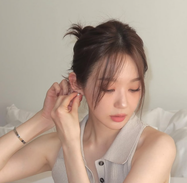 다만 헤어라인과 얼굴형이 그대로 드러나 부담스러울 수 있는데,강민경은 이마 양옆 잔머리를 살짝 빼여리여리한 인상을 더했다.덕분에 헤어라인이 비어 보이지 않고 자연스러웠다.