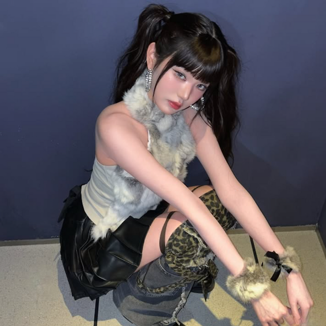 퍼 베스트와 플리츠 미니스커트를 착용했어요.
