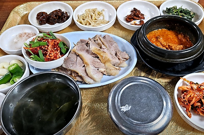 보쌈정식: 촉촉한 보쌈과 신선한 쌈채소, 보리밥, 각종 반찬까지 포함. 8,000~10,000원대.