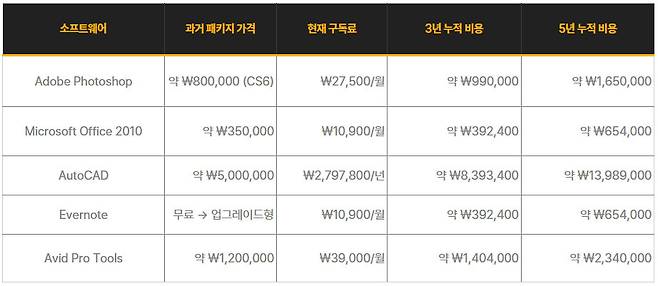 MS Office 역시 마찬가지다. Office 2010 패키지는 과거 약 35만 원에 판매되었으나, 현재는 월 10,900원(연간 약 13만 원) 수준의 구독료를 내야 한다. 이 경우도 대략 3년 이상 사용하면 과거 패키지 가격을 넘어서게 된다.